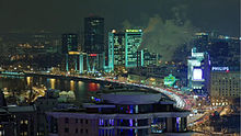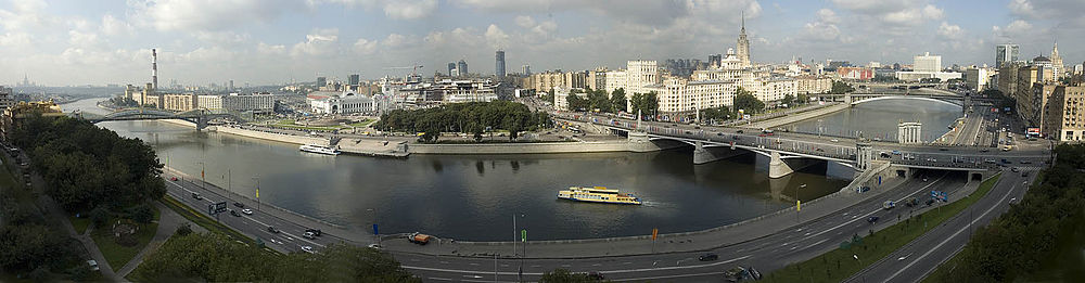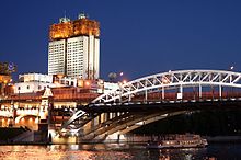 View from to Moskva River. Left: Bohdan Khmelnytskyi Bridge, centre: Square of Europe and Kiyevsky Rail Terminal, behind: Moskva-city under construction, right: Borodinsky Bridge, behind: House of the Government of the Russian Federation