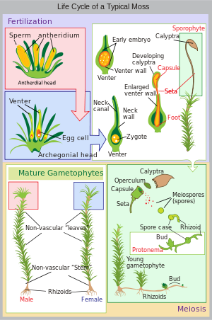 Mosses can be either dioicous (compare dioecious in seed plants) or monoicous (compare monoecious). In dioicous mosses, both male and female sex organs are borne on different gametophyte plants. In monoicous (also called autoicous) mosses, they are borne on the same plant. In the presence of water, sperm from the antheridia swim to the archegonia and fertilisation occurs, leading to the production of a diploid sporophyte. The sperm of mosses is biflagellate, i.e. they have two flagella that aid in propulsion. Since the sperm must swim to the archegonium, fertilisation cannot occur without water. After fertilisation, the immature sporophyte pushes its way out of the archegonial venter. It takes about a quarter to half a year for the sporophyte to mature. The sporophyte body comprises a long stalk, called a seta, and a capsule capped by a cap called the operculum. The capsule and operculum are in turn sheathed by a haploid calyptra which is the remains of the archegonial venter. The calyptra usually falls off when the capsule is mature. Within the capsule, spore-producing cells undergo meiosis to form haploid spores, upon which the cycle can start again. The mouth of the capsule is usually ringed by a set of teeth called peristome. This may be absent in some mosses.