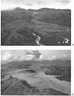 Tephra fall from these four large eruptions was extensive to the southwest of the volcano. Two hours after the last of these four explosions, a series of eruptions began which lasted for the next 24 hours, and which saw the production of much larger pyroclastic flows and surges which travelled several kilometres down river valleys on the flanks of the volcano.
