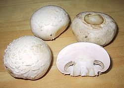 A mushroom is the fleshy, spore-bearing fruiting body of a fungus, typically produced above ground on soil or on its food source. The standard for the name "mushroom" is the cultivated white button mushroom, Agaricus bisporus, hence the word mushroom is most often applied to fungi ( Basidiomycota, Agaricomycetes) that have a stem ( stipe), a cap ( pileus), and gills (lamellae, sing. lamella) on the underside of the cap just as do store-bought white mushrooms. However, "mushroom" can also refer to a wide variety of gilled fungi, with or without stems, and the term is used even more generally to describe both the fleshy fruiting bodies of some Ascomycota and the woody or leathery fruiting bodies of some Basidiomycota, depending upon the context of the word. Forms deviating from the standard form usually have more specific names, such as " puffball", " stinkhorn", and " morel", and gilled mushrooms themselves are often called " agarics" in reference to their similarity to Agaricus or their placement in the order Agaricales. By extension, "mushroom" can also designate the entire fungus when in culture or the thallus (called a mycelium) of species forming the fruiting bodies called mushrooms.