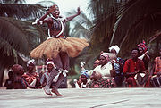 An African woman, wearing native garments, performs during a visit from participants in the West Africa Training Cruise 1983.