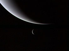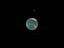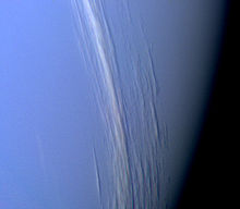 ![]() Neptune from Voyager 2 with Great Dark Spot at left and Small Dark Spot at lower right. White clouds are composed of methane ice; overall blue coloration is due at least in part to methane absorption of red light.  |