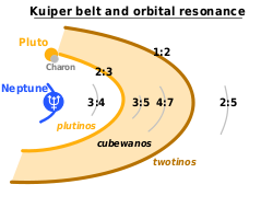 There do exist orbits within these empty regions where objects can survive for the age of the Solar System. These resonances occur when Neptune's orbital period is a precise fraction of that of the object, such as 1:2, or 3:4. If, say, an object orbits the Sun once for every two Neptune orbits, it will only complete half an orbit by the time Neptune returns to its original position. The most heavily populated resonance in the Kuiper belt, with over 200 known objects, is the 2:3 resonance. Objects in this resonance complete 2 orbits for every 3 of Neptune, and are known as plutinos because the largest of the known Kuiper belt objects, Pluto, is among them. Although Pluto crosses Neptune's orbit regularly, the 2:3 resonance ensures they can never collide. The 3:4, 3:5, 4:7 and 2:5 resonances are less populated.