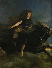Nótt, the Norse goddess of the night, rides her horse in this 19th century painting by Peter Nicolai Arbo.