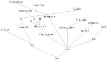 The interrelationship between various significant ancient manuscripts of the Old Testament, according to the Encyclopaedia Biblica (1903) Some manuscripts are identified by their siglum. LXX here denotes the original Septuagint.