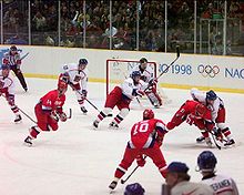 An ice hockey game during the 1928 Winter Olympics at St. Moritz.