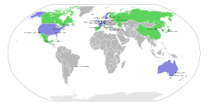 Map of Summer Olympics locations. Countries that have hosted one Summer Olympics are shaded green, while countries that have hosted two or more are shaded blue.