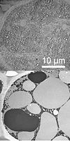 Osmium tetroxide has been used in fingerprint detection and in staining fatty tissue for optical and electron microscopy. As a strong oxidant, it cross-links lipids mainly by reacting with unsaturated carbon-carbon bonds, and thereby both fixes biological membranes in place in tissue samples and simultaneously stains them. Because osmium atoms are extremely electron dense, osmium staining greatly enhances image contrast in transmission electron microscopy (TEM) studies of biological materials. Those carbon materials have otherwise very weak TEM contrast (see image). Another osmium compound, osmium ferricyanide (OsFeCN), exhibits similar fixing and staining action.