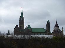 | Centre Block on Parliament Hill, the National War Memorial in downtown Ottawa, the National Gallery of Canada, and the Rideau Canal and Château Laurier. | |||