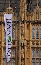In February 2008, five campaigners from the Plane Stupid group gained admittance to the building as visitors and then moved up to the roof to demonstrate against the proposed expansion of Heathrow Airport; from there they hung two banners they had smuggled past security. MPs and security experts found it worrying that the protesters made it to the roof in spite of the heightened security measures, and the prosecution at the activists' trial argued that they may have received help from a House of Lords employee. In October 2009, at least forty Greenpeace activists climbed to the roof of Westminster Hall to call for the adoption of policies combating climate change. Some of them climbed down after nearly five hours, while the rest spent the night on the roof.