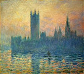 During three trips to London between 1899 and 1901, Impressionist painter Claude Monet worked on a series of canvasses that depicted the Palace of Westminster under various lighting conditions; the building was often shrouded in the smog prevalent in the city in Victorian times. The paintings share the same vantage point—a terrace at St Thomas's Hospital, across the river from the Palace—and many of the works were finished in Monet's studio in France over the following years.