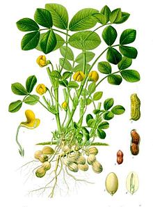 The peanut, or groundnut (Arachis hypogaea), is a species in the legume or "bean" family ( Fabaceae). The peanut was probably first domesticated and cultivated in the valleys of Paraguay. It is an annual herbaceous plant growing 30 to 50 cm (1.0 to 1.6 ft) tall. The leaves are opposite, pinnate with four leaflets (two opposite pairs; no terminal leaflet), each leaflet is 1 to 7 cm (⅜ to 2¾ in) long and 1 to 3 cm (⅜ to 1 inch) broad.