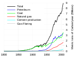 When burned, petroleum releases carbon dioxide; a greenhouse gas. Along with the burning of coal, petroleum combustion is the largest contributor to the increase in atmospheric CO2. Atmospheric CO2 has risen steadily since the industrial revolution to current levels of over 390 ppmv, from the 180 – 300 ppmv of the prior 800 thousand years, driving global warming. The unbridled use of petroleum could potentially cause a runaway greenhouse effect on Earth. So far, the Earth's temperature has been raised by almost an entire degree Celsius. This raise in temperature has reduced the Arctic ice cap to 1,100,000 sq mi (2,800,000 km2), smaller than ever recorded. Because of this melt, more oil reserves have been revealed. It is estimated by the International Energy Agency that about 13 per cent of the world's undiscovered oil resides in the Arctic.