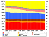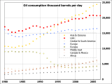 Petroleum is vital to many industries, and is of importance to the maintenance of industrialized civilization itself, and thus is critical concern to many nations. Oil accounts for a large percentage of the world's energy consumption, ranging from a low of 32 percent for Europe and Asia, up to a high of 53 percent for the Middle East, South and Central America (44%), Africa (41%), and North America (40%). The world at large consumes 30 billion barrels (4.8 km³) of oil per year, and the top oil consumers largely consist of developed nations. In fact, 24 percent of the oil consumed in 2004 went to the United States alone, though by 2007 this had dropped to 21 per cent of world oil consumed.