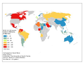 Today, about 90 per cent of vehicular fuel needs are met by oil. Petroleum also makes up 40 per cent of total energy consumption in the United States, but is responsible for only 1 per cent of electricity generation. Petroleum's worth as a portable, dense energy source powering the vast majority of vehicles and as the base of many industrial chemicals makes it one of the world's most important commodities. Viability of the oil commodity is controlled by several key parameters, number of vehicles in the world competing for fuel, quantity of oil exported to the world market ( Export Land Model), Net Energy Gain (economically useful energy provided minus energy consumed), political stability of oil exporting nations and ability to defend oil supply lines.