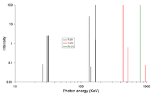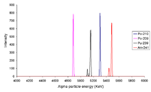 Emission intensity vs. alpha energy for four isotopes, note that the line width is wide and some of the fine details can not be seen. This is for liquid scintillation counting where random effects cause a variation in the number of visible photons generated per alpha decay.