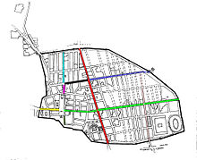 A Map of Pompeii, featuring the main roads, the Cardo Maximus is in Red and the Decumani Maximi are in green and dark blue. The southwest corner features the main forum and is the oldest part of the town.