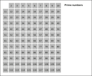 The distribution of all the prime numbers in the range of 1 to 76,800, from left to right and top to bottom, where each pixel represents a number. Black pixels mean that number is prime and white means it is not prime.