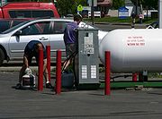 The advantage of propane is its liquid state at a moderate pressure. This allows fast refill times, affordable fuel tank construction, and ranges comparable to (though still less than) gasoline. Meanwhile it is noticeably cleaner (both in handling, and in combustion), results in less engine wear (due to carbon deposits) without diluting engine oil (often extending oil-change intervals), and until recently was a relative bargain in North America. Octane rating is a noticeably higher 110, which could result in more power, though exploiting this extra "octane" requires significant engine modification. However, public filling stations are still rare. Many converted vehicles have provisions for topping off from "barbecue bottles." Purpose-built vehicles are often in commercially-owned fleets, and have private fueling facilities.