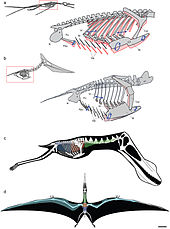 As evidenced by hollow cavities in the wing bones of larger species and soft tissue preserved in at least one specimen, some pterosaurs extended their system of respiratory air sacs (see Paleobiology section below) into the wing membrane itself.