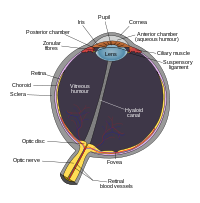 The pupil is the opening that is located in the centre of the iris of the eye and that controls the amount of light that enters the eye. It appears black because most of the light entering the pupil is absorbed by the tissues inside the eye. In optical terms, the anatomical pupil is the eye's aperture and the iris is the aperture stop. The image of the pupil as seen from outside the eye is the entrance pupil, which does not exactly correspond to the location and size of the physical pupil because it is magnified by the cornea.
