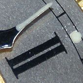 Self-luminous white paint which contains radium on the face and hand of an old clock.