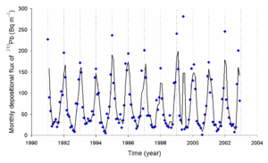 210Pb is formed from the decay of 222Rn. Here is a typical deposition rate of 210Pb as observed in Japan as a function of time, due to variations in radon concentration.
