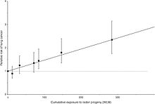 A controversial epidemiological study showing decreased cancer risk vs. radon domestic exposure (5 pCi/L ≈ 200 Bq/m3). This study lacks individual level controls for smoking and radon exposure, and therefore lacks statistical power to draw definitive conclusions. Because of this the error bars (which simply reflect the raw data variability) are probably too small. Among other expert panels, the WHO's International Agency for Research on Cancer concluded that these analyses "can be rejected."