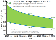 Solar photovoltaic cells (PV) convert sunlight into electricity and photovoltaic production has been increasing by an average of more than 20% each year since 2002, making it a fast-growing energy technology. While wind is often cited as the fastest growing energy source, photovoltaics since 2007 has been increasing at twice the rate of wind - an average of 63.6%/year, due to the reduction in cost. At the end of 2011 the photovoltaic (PV) capacity world-wide was 67.4 GW, a 69.8% annual increase. Top capacity countries were, in GW: Germany 24.7, Italy 12.8, Japan 4.7, Spain 4.4, the USA 4.4, and China 3.1.