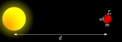 The gravitational pull F_G on the mass u towards the satellite with mass m and radius r can be expressed according to Newton's law of gravitation.