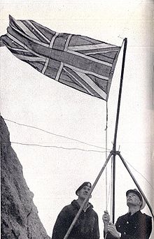 On 18 September 1955 at precisely 10.16 am, in what would be the final territorial expansion of the British Empire, the island was officially annexed by the British Crown when Lieutenant-Commander Desmond Scott RN, Sergeant Brian Peel RM, Corporal AA Fraser RM, and James Fisher (a civilian naturalist and former Royal Marine), were deposited on the island by a Royal Navy helicopter from HMS Vidal (coincidentally named after the man who first charted the island). The team cemented in a brass plaque on Hall's Ledge and hoisted the Union Flag to stake the UK's claim. The inscription on the plaque read: