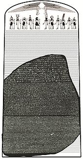 The Rosetta Stone is an ancient Egyptian granodiorite stele inscribed with a decree issued at Memphis in 196 BC on behalf of King Ptolemy V. The decree appears in three scripts: the upper text is Ancient Egyptian hieroglyphs, the middle portion Demotic script, and the lowest Ancient Greek. Because it presents essentially the same text in all three scripts (with some minor differences between them), it provided the key to the modern understanding of Egyptian hieroglyphs.