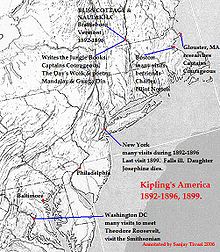 The couple settled upon a honeymoon that would take them first to the United States (including a stop at the Balestier family estate near Brattleboro, Vermont) and then on to Japan. However, when they arrived in Yokohama, Japan, they discovered that their bank, The New Oriental Banking Corporation, had failed. Taking this loss in their stride, they returned to the U.S., back to Vermont—Carrie by this time was pregnant with their first child—and rented a small cottage on a farm near Brattleboro for ten dollars a month. According to Kipling, "We furnished it with a simplicity that fore-ran the hire-purchase system. We bought, second or third hand, a huge, hot-air stove which we installed in the cellar. We cut generous holes in our thin floors for its eight-inch [20 cm] tin pipes (why we were not burned in our beds each week of the winter I never can understand) and we were extraordinarily and self-centredly content."