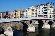 | Top: Downtown Sarajevo; Middle: Latin Bridge (left), Sebilj (right); Bottom: Emperor's Mosque (left), Cathedral of Jesus' Heart (centre), Serb Orthodox Cathedral (right) | |||