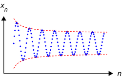 An infinite sequence of real numbers (in blue). This sequence is neither increasing, nor decreasing, nor convergent. It is however bounded.