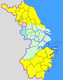 The Yangtze River Delta is shown in green in this map of Shanghai (on the east at centre) alongside the neighboring provinces of Jiangsu (to the north and west) and Zhejiang (to the south and west). Parts of Jiangsu and Zhejiang which are outside the Yangtze River Delta are shown in yellow. Provincial boundaries are shown in purple, sub-provincial boundaries in grey.