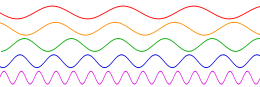 Sinusoidal waves of various frequencies; the bottom waves have higher frequencies than those above. The horizontal axis represents time.