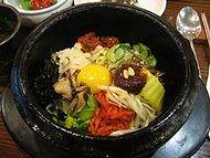 Korean cuisine is largely based on rice, noodles, tofu, vegetables, fish and meats. Traditional Korean meals are noted for the number of side dishes, banchan (반찬), which accompany steam-cooked short-grain rice. Every meal is accompanied by numerous banchan. Kimchi (김치), a fermented, usually spicy vegetable dish is commonly served at every meal and is one of the best known Korean dishes. Korean cuisine usually involves heavy seasoning with sesame oil, doenjang (된장), a type of fermented soybean paste, soy sauce, salt, garlic, ginger, and gochujang (고추장), a hot pepper paste.