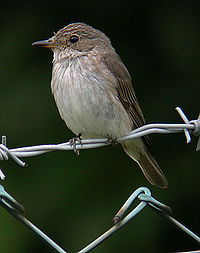 The Spotted Flycatcher, Muscicapa striata, is a small passerine bird in the Old World flycatcher family. It breeds in most of Europe and western Asia, and is migratory, wintering in Africa and south western Asia. It is declining in parts of its range.