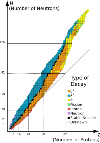 | Energetically unstable to one or more known decay modes, but no decay yet seen. Considered stable until radioactivity confirmed. | 164 | 254 | Spontaneous fission possible for "stable" nuclides > niobium-93. Other mechanisms possible for heavier nuclides. Total is the classically stable nuclides |
