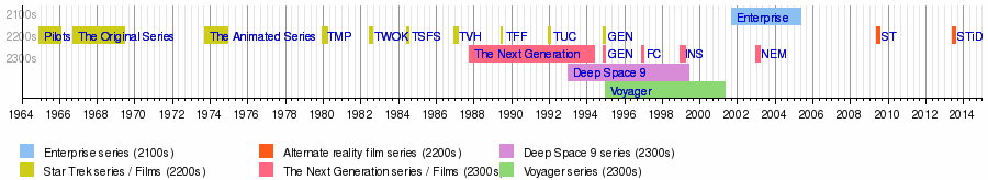 | Television series | Star Trek: The Original Series (1966–1969) Star Trek: The Animated Series (1973–1974) Star Trek: The Next Generation (1987–1994) Star Trek: Deep Space Nine (1993–1999) Star Trek: Voyager (1995–2001) Star Trek: Enterprise (2001–2005) |