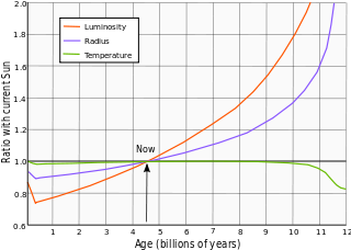 At its largest, the Sun will have a maximum radius beyond the Earth's current orbit, 1 AU (1.5×1011 m), 250 times the present radius of the Sun. When the Sun is an asymptotic giant branch star, it will have lost roughly 30% of its present mass due to a stellar wind, so the orbits of the planets will move outward. If it were only for this, Earth would probably remain outside the sun. However, new research suggests that Earth will be engulfed owing to tidal interactions. If Earth should escape incineration in the Sun, its water will be boiled away and most of its atmosphere will escape into space. During its life in the main sequence, the Sun is becoming more luminous (about 10% every 1 billion years) and its surface temperature is slowly rising. The Sun used to be fainter in its early past. The increase in solar temperatures is such that in about another billion years the surface of the Earth will probably become too hot for liquid water to exist, ending all terrestrial life.