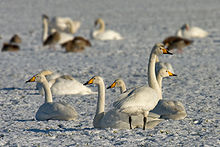- Whooper Swan, Cygnus cygnus breeds in Iceland and subarctic Europe and Asia, migrating to temperate Europe and Asia in winter
