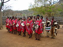 Swazi people dancing in a cultural village show.