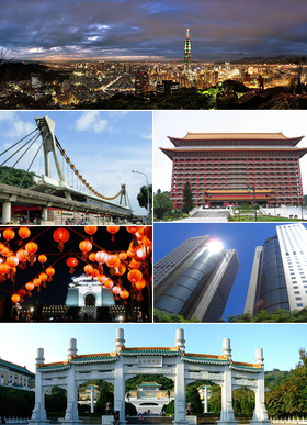 Clockwise from top: Taipei skyline, Grand Hotel, FarEastern Plaza, National Palace Museum, National Chiang Kai-shek Memorial Hall, Taipei Metro ( Jiantan Station)