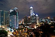 The Rajprasong, Chidlom and Sukhumvit skylines of Bangkok at night.