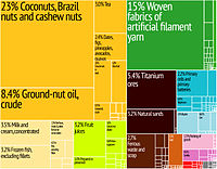 Graphical depiction of Gambian product exports in 28 colour-coded categories.