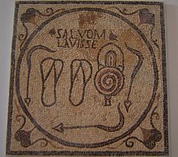 Mosaic bath sign from Sabratha, Libya, showing bathing sandals, three strigils, and the slogan SALVOM LAVISSE, "A bath is good for you"