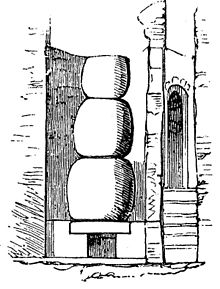There were three boilers, one of which (caldarium vas) held the hot water; a second, the tepid (tepidarium); and the third, the cold (frigidarium). The warm water was turned into the warm bath by a pipe through the wall, marked on the plan. Underneath the hot chamber was set the circular furnace d, of more than 7 ft. in diameter, which heated the water and poured hot air into the hollow cells of the hypocaustum. It passed from the furnace under the first and last of the caldrons by two flues, which are marked on the plan. The boiler containing hot water was placed immediately over the furnace; and, as the water was drawn out from there, it was supplied from the next, the tepidarium, which was raised a little higher and stood a little way off from the furnace. It was already considerably heated from its contiguity to the furnace and the hypocaust below it, so that it supplied the deficiency of the former without materially diminishing its temperature; and the vacuum in this last was again filled up from the farthest removed, which contained the cold water received directly from the square reservoir seen behind them. The boilers themselves no longer remain, but the impressions which they have left in the mortar in which they were imbedded are clearly visible, and enable us to determine their respective positions and dimensions. Such coppers or boilers appear to have been called miliaria, from their similarity of shape to a milestone.