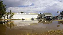 Flash flooding is the process where a landscape, most notably an urban environment, is subjected to rapid floods. These rapid floods occur more quickly and are more localized than seasonal river flooding or areal flooding and are frequently (though not always) associated with intense rainfall. Flash flooding can frequently occur in slow-moving thunderstorms and is usually caused by the heavy liquid precipitation that accompanies it. Flash floods are most common in densely populated urban environments, where few plants and bodies of water are present to absorb and contain the extra water. Flash flooding can be hazardous to small infrastructure, such as bridges, and weakly constructed buildings. Plants and crops in agricultural areas can be destroyed and devastated by the force of raging water. Automobiles parked within affected areas can also be displaced. Soil erosion can occur as well, exposing risks of landslide phenomena.